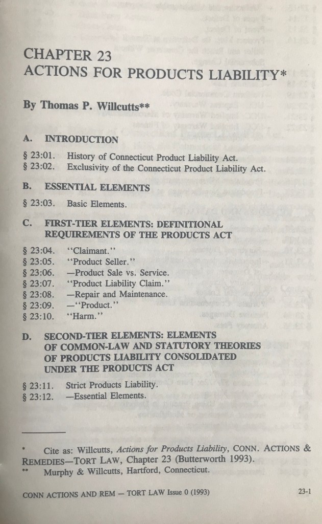 Beginning with his work as an insurance defense attorney with Halloran & Sage, Tom has extensive experience in litigating product liability claims. Once again, there is no substitute for having worked on the defense side of these claims. Before Tom began to dedicate his practice to representing plaintiffs. Tom’s extensive experience in handling product liability cases led to his being asked to write the Chapter on the subject in the two-volume Practice Manual published by Butterworth Legal Publishers – CONNECTICUT ACTIONS AND REMEDIES.